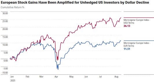 The chart above compares the cumulative return performance of the Morningstar Europe Index’s return in terms of U.S. Dollar’s and Euros from January to August 2025. It highlights the value of international stock inclusion for currency diversification and enhanced returns.
