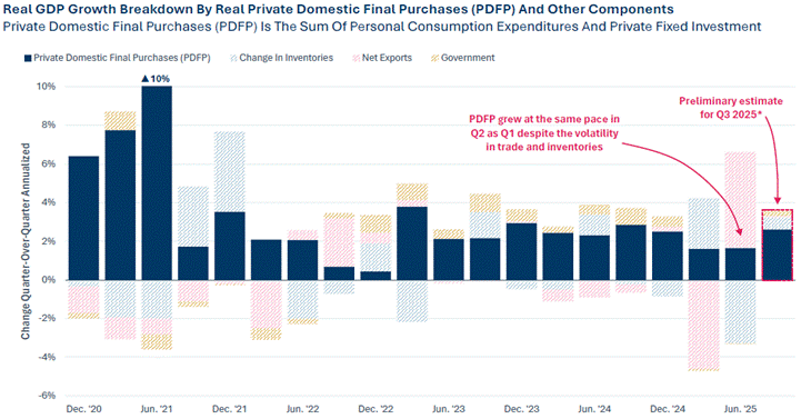 The chart above illustrates the Real GDP growth breakdown by Real Private Domestic Final Purchases (PDFP), which includes personal consumption expenditures and private fixed investment. Despite the volatility in trade and inventories, PDFP grew at the same pace in the second quarter as it did in the first quarter, highlighting the resilience in consumer and investment spending. As such, this consumption-driven momentum is poised to support economic growth for the foreseeable future.